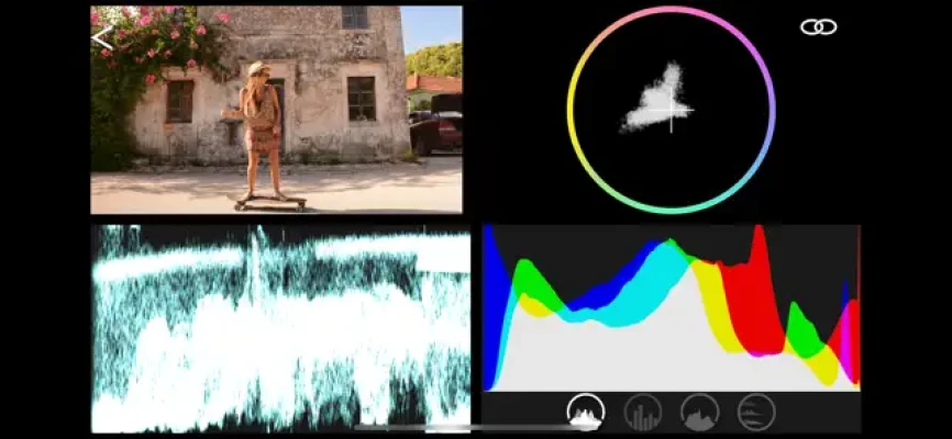 - Vectorscope: Displays color saturation, by channel, across the entire image.