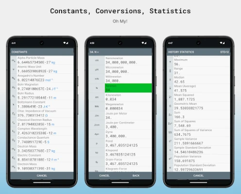 - A high-precision Scientific Calculator with Fractions, Complex Numbers, Physical Constants, a Unit Converter, Advanced Statistics, History & Memory Registers and a full-online Help Section.