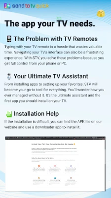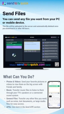 Send to TV Quick is the next-generation Sideloading and Remote Management Tool for Android TV, Google TV, and Fire TV. Re-engineer your TV experience by moving the control interface from the clumsy remote to your Smartphone or PC Web Browser.