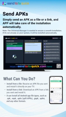 Direct URL Injection: Simply paste download URLs (APK, ZIP, M3U) on your phone via sendtotvquick.com. The file downloads and prompts for installation on the TV instantly.