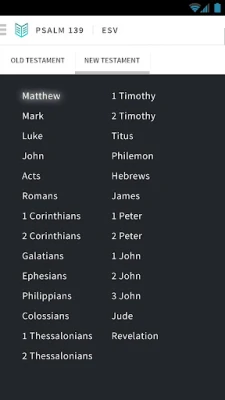 • Settings for font size, preferred Bible translation, red letter function, and nighttime display