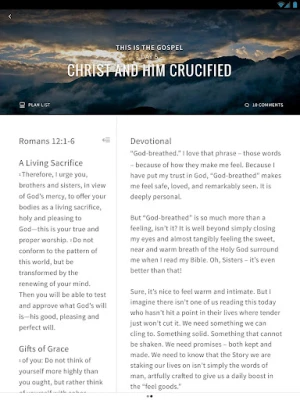 This app is designed with you in mind—to give you (and your friends!) a beautiful, functional and accessible Bible-reading and devotional tool in the palm of your hands. The app features—
