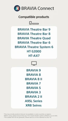 TVs:BRAVIA 9, 8 II, 8, 7, 5, 3, 2 II, A95L Series, XR8 Series