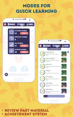 Modes for quick learning The App includes four additional lesson types which are made of Favorites, Difficult, Old, Random words. You can add any word to your favorites and later create custom lesson from your Favorite words. Words are automatically added to "Difficult" (the ones you struggle to memorize) and "Old" (which you have not reviewed for a long time) sections. A "Random" mode will create a unique lesson.