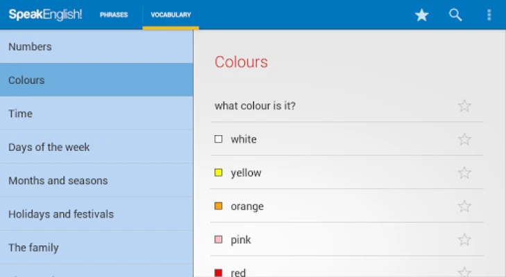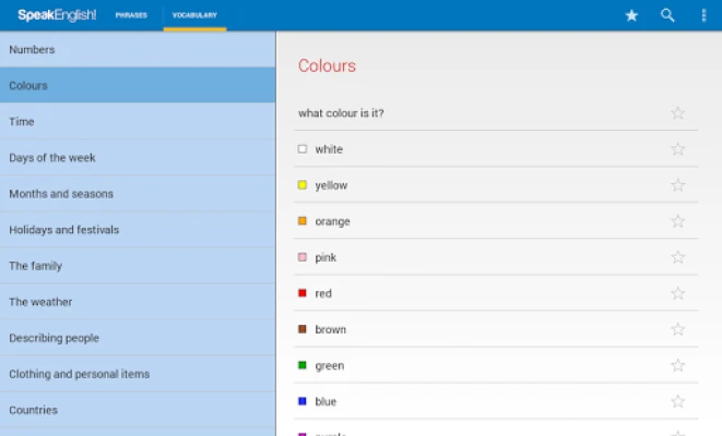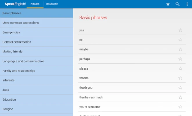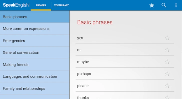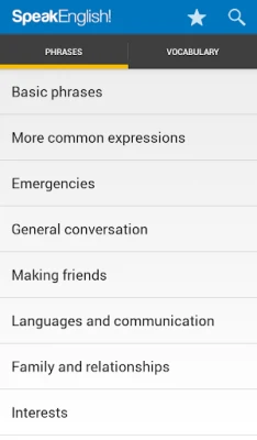 The phrase guide part of the app contains over 2,500 English phrases divided into sixty everyday topics. The vocabulary part contains a further 3,500 essential English words sorted into themed lists.