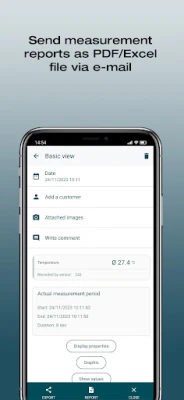 - Efficient: Create digital measurement reports including. photos as PDF/ CSV files on site and send them via e-mail.