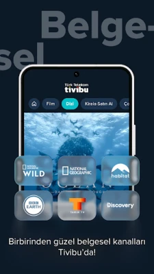 Documentary; Local and foreign documentary channels and contents such as Nat Geo, Nat Geo Wild, Habitat, Tarih TV, TRT Belgesel, Viasat History, Discovery Channel, Love Nature, BBC Earth, ID are together on Tivibu