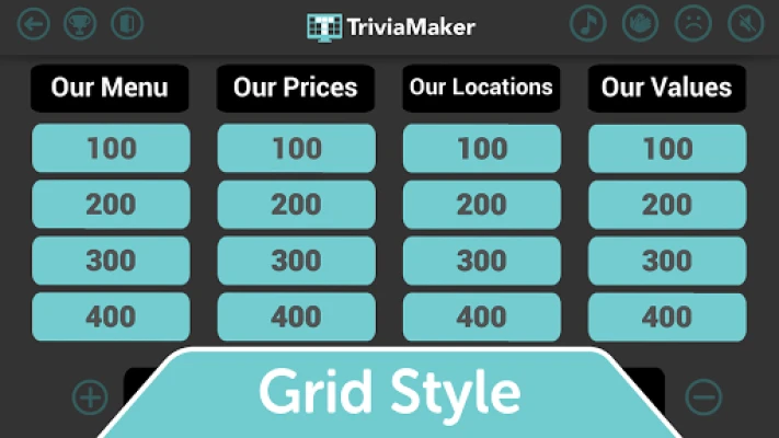 Trivia Maker is an exciting "build your own quiz / gameshow" app. The layout of the board is a lot like the game Jeopardy, Family Feud, Who Wants to be a Millionaire, or other trivia game shows.