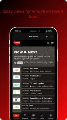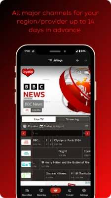 TV listings for hundreds of UK linear TV channels & major streaming providers. Views for Now & Next, What's on Later, New Films, Sport, Drama and Best Of streaming guides. Region/provider selection and predictive search for shows.