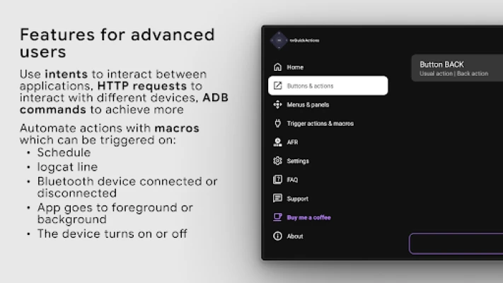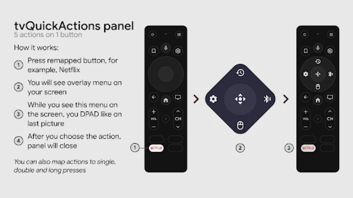 tvQuickActions is a button/key mapper developed specially for TV devices. Supports Android TV, Google TV and AOSP on most devices.