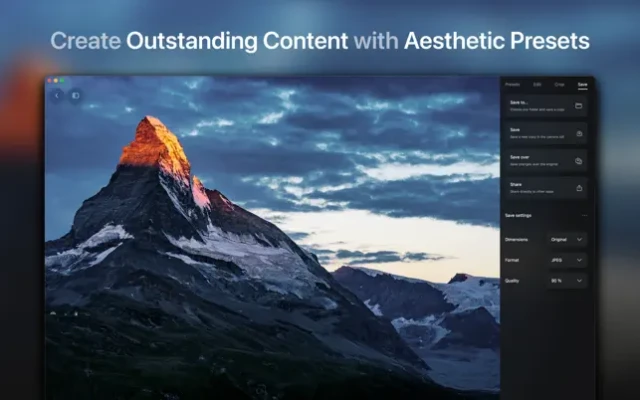 • Non-destructive editing and automatic saving. Continue or revert your changes later.