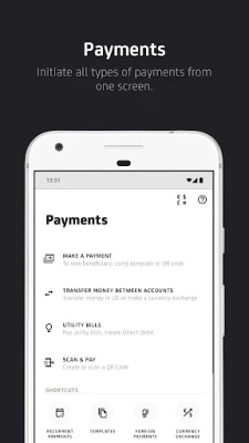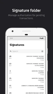 In the Payments section, you will find all the types of payments you need. The application is synchronized with the templates from your BusinessNet account, which you can see in the list of beneficiaries. Additionally, the Signatures section is intended for created instructions that need to be authorized, supported by the fact that the BusinessNet and Business Mobile applications are now interconnected for payment creation and authorization workflows.