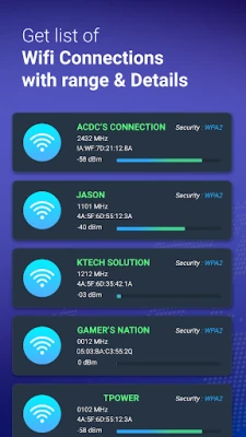 You can directly turn on/off Wi-Fi from the app. Also get the nearby Wi-Fi network details. Check your connected Wi-Fi speed and performance. Save the Wi-Fi speed test history.