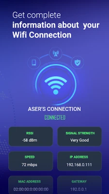 - Know your signal strength of your connected Wi-Fi. - Details of Wi-Fi connection like MAC address, SSID, BSSID, RSSID, Ip address etc. - RSSI Detector lets you track Wi-Fi RSSI strength live and identify the strongest signal around you. - Get full details of available nearby Wi-Fi networks. - Check connected Wi-Fi network speed and performance. - Save speed test history and data.
